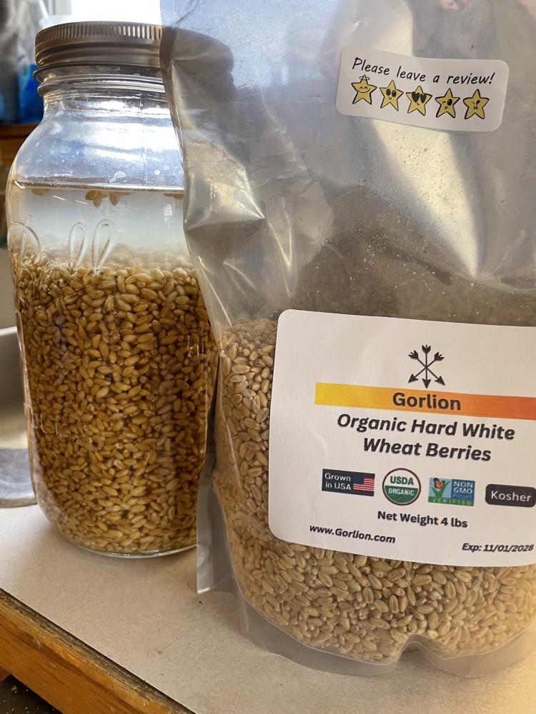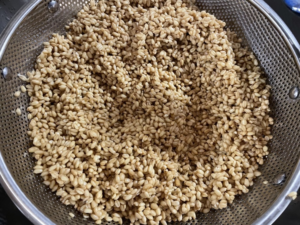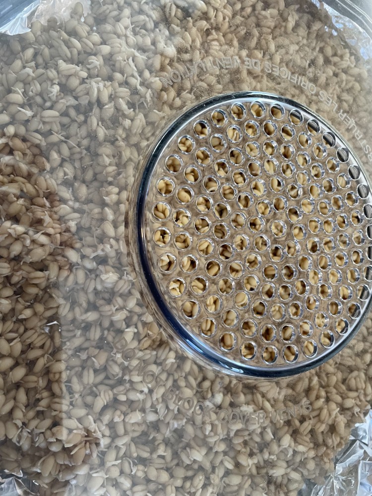 The next day, I drained the wheat in the colander thoroughly, and returned it to the jar. At this point the wheat is hydrated, and needs to be rinsed every 12 hours. If the grain is laid out, it can simply be mixed up and misted, but extra care is needed to make sure it doesn’t stay too wet and end up moldy.