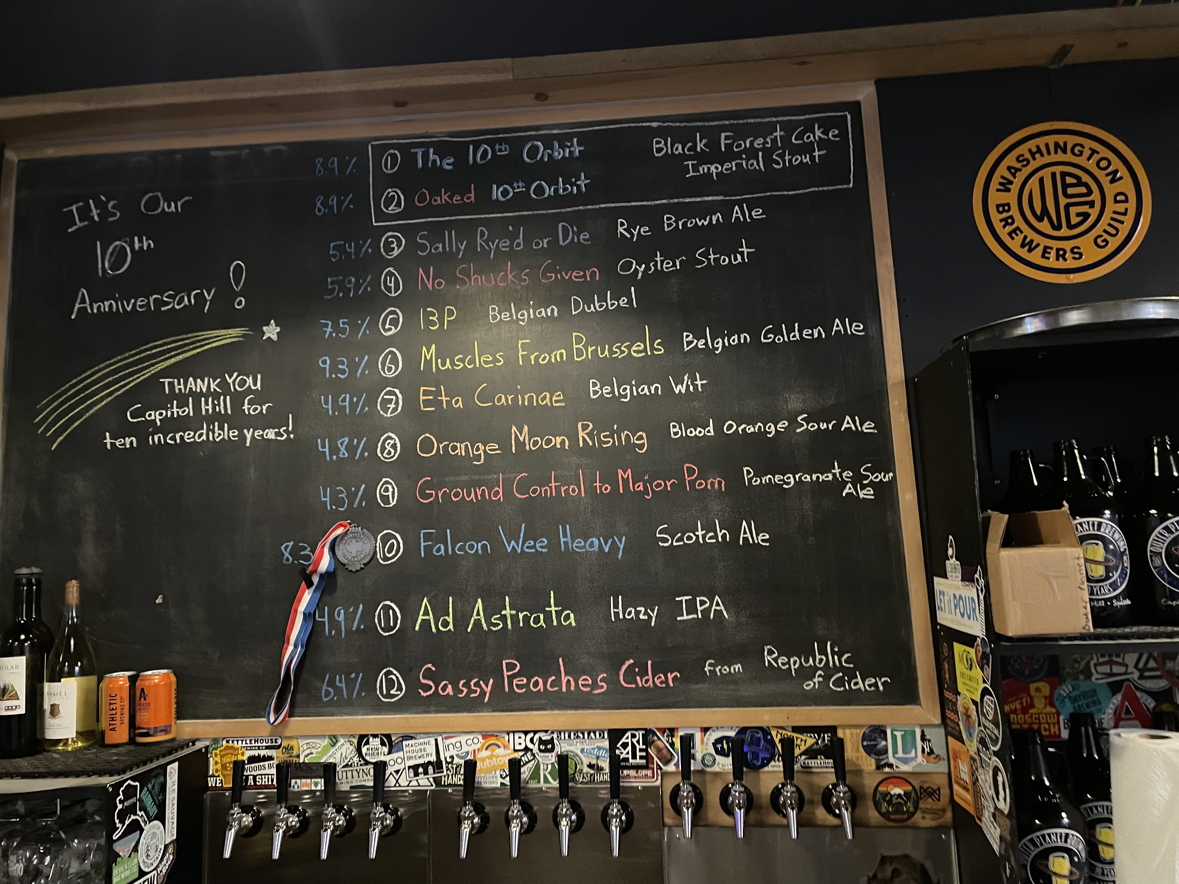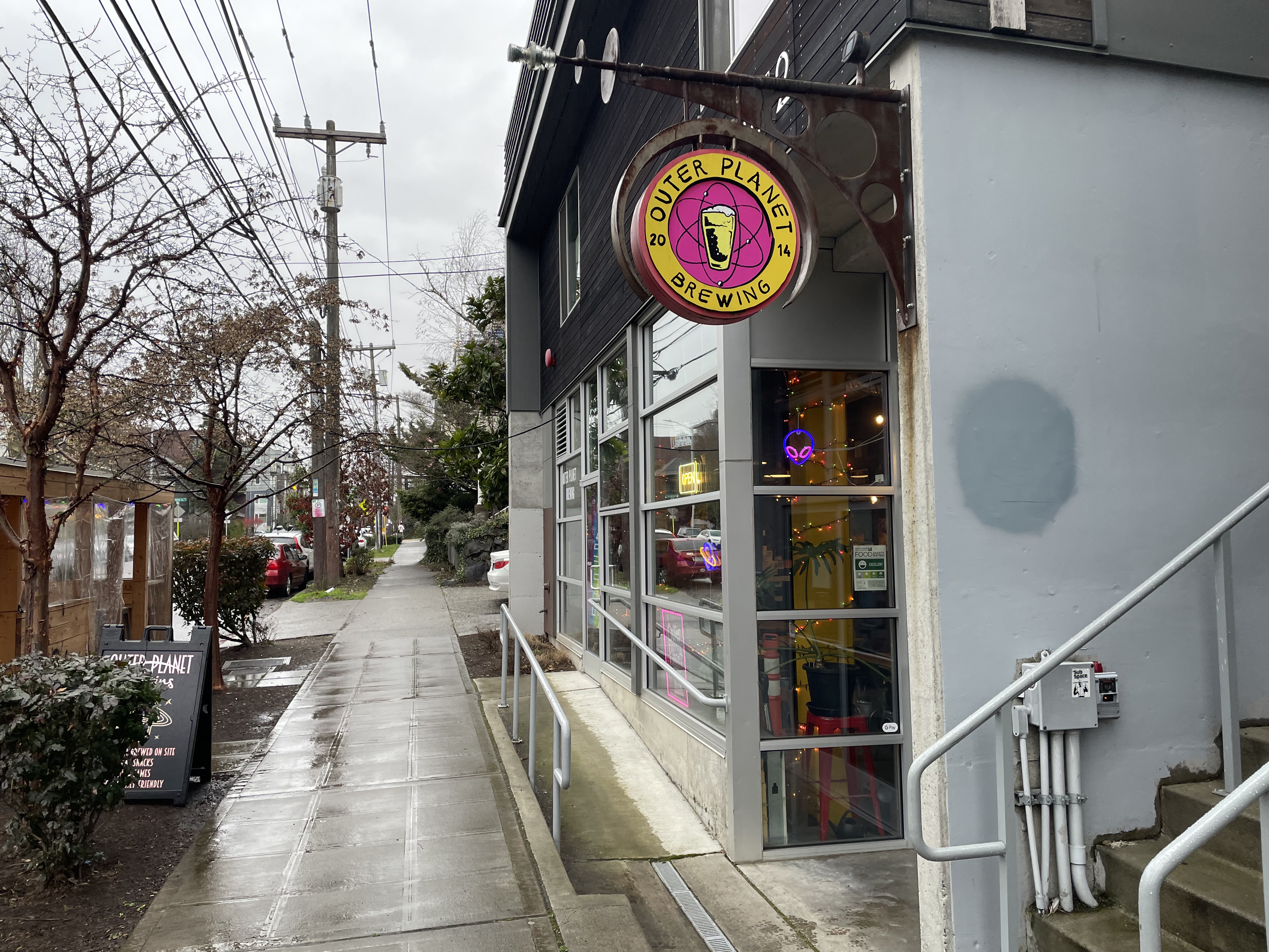 When I saw "Outer Planet Brewing" in the Capital Hill neighborhood, I knew immediately we had to make a stop. It turned out by happy accident that my friend and I would be there on Outer Planet's 10th anniversary weekend, so they had special "anniversary flights" of prior year's releases. Meaning, they were all strong ales, imperial stouts, etc. Unfortunately, that means I didn't get to try too many of their normal space themed beers, though I did insist on getting a taster of their Oyster Stout, just because that's something I don't see too often anymore.